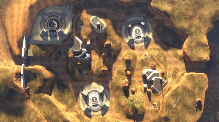I giocatori iniziano in due basi in cemento armato, separate dalla vallata, che sono più alte che larghe: in cima alla base si trovano un paio di coperture con in mezzo una Torretta, che domina il paesaggio; stessa cosa per l'altra base. Scendendo si trovano dei sottolivelli, alcuni con un'arma specifica, altri con degli equipaggiamenti; dentro all'edificio spesso si trovano delle armi di piccolo calibro (come Spiker e SMG) assieme ad armi tipo la Carabina Covenant o simili, che saranno molto utili, essendo questa una mappa molto spaziosa. Idem per l'altra base.