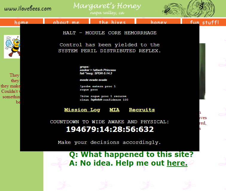 В 2552 году инопланетный артефакт разделяет ИИ ККОН Мелисса на три части. Одна часть остается в 2552 году, страдает амнезией и получает имя Дурга. Две другие части, Оператор и Спящая принцесса, отправляются в прошлое на сайт "Я люблю пчел". С ними также находится ИИ Троянский конь ("Искатель"), посланный Ковенантом в качестве шпиона. Оператор ошибочно полагает, что Спящая Принцесса и есть Троянский Конь, и пытается ее убить. Участники ARG общались с Оператором и Спящей Принцессой, чтобы узнать подробности сюжета, формируя различные фракции для каждого из персонажей.