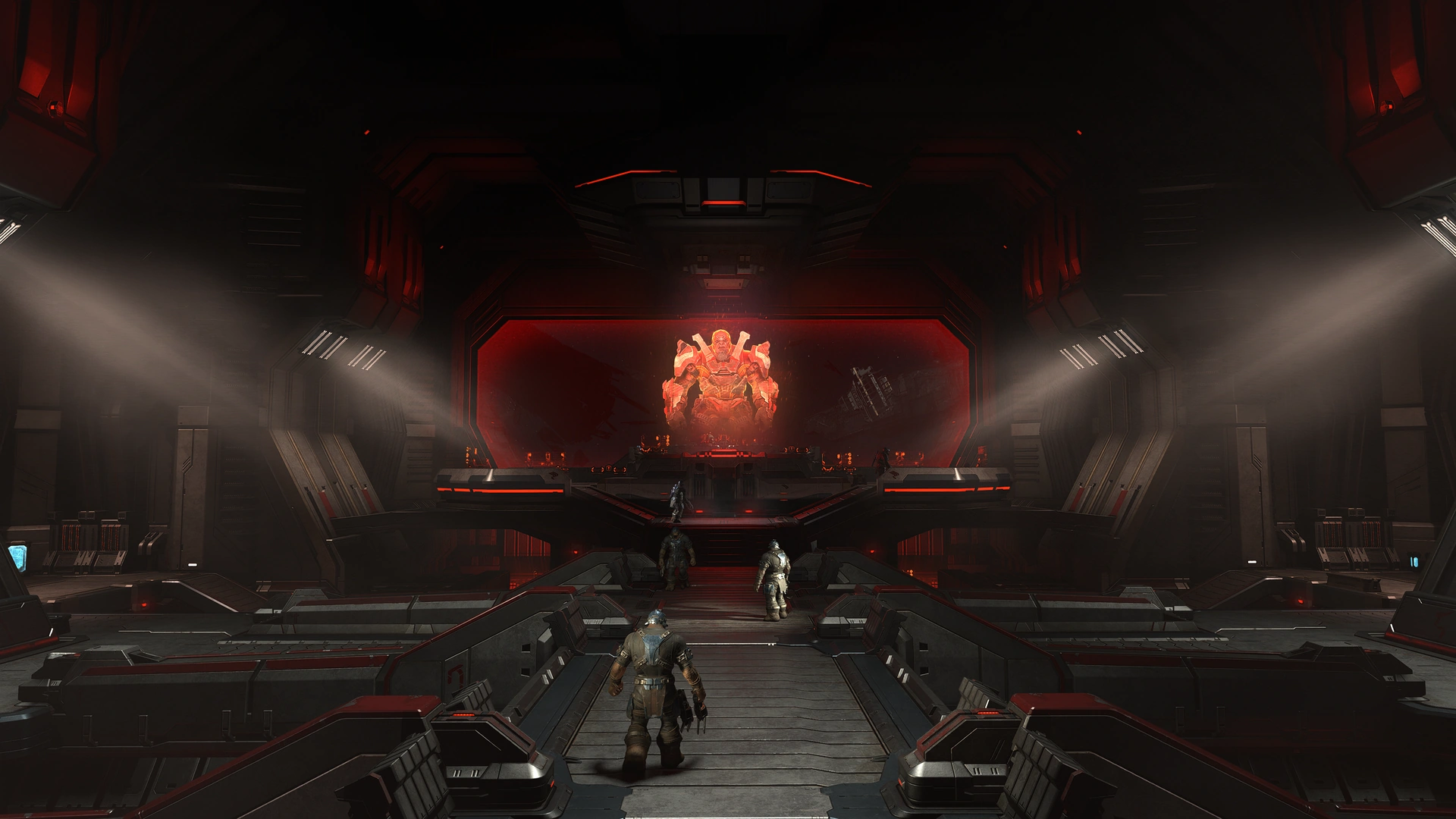 Голограмма исчезает. Мастер Чиф выходит из комнаты и входит в главный ангарный отсек, где структуры Изгнанников готовились к развертыванию.