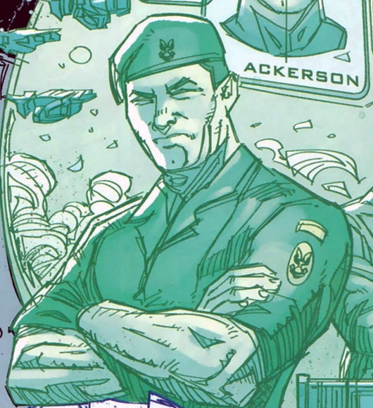 Джеймс Акерсон - полковник сухопутных войск Космического Командования Объединенных Наций и сотрудник Службы военной разведки. В его послужном списке написано, что он пережил, по крайней мере, три сражения с Ковенантом, а в самом начале войны с Ковенантом он добился повышения и участия в десятке секретных операций. СВР наняло Акерсона в качестве офицера связи, который бы поддерживал отношения между военной разведкой и армией.[2]