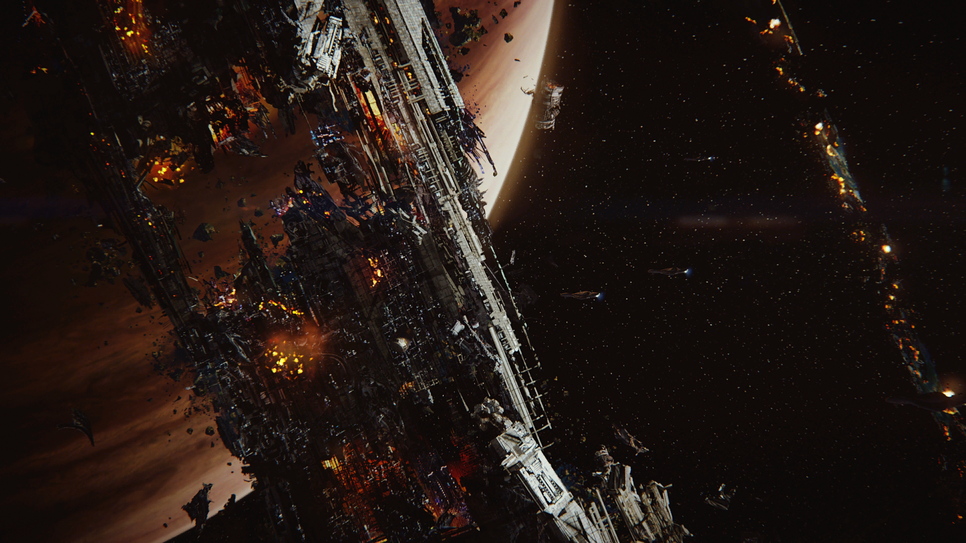 На экране появляются еще горящие обломки Установки 04. Группа ковенантских крейсеров CCS-класса движется между ними.