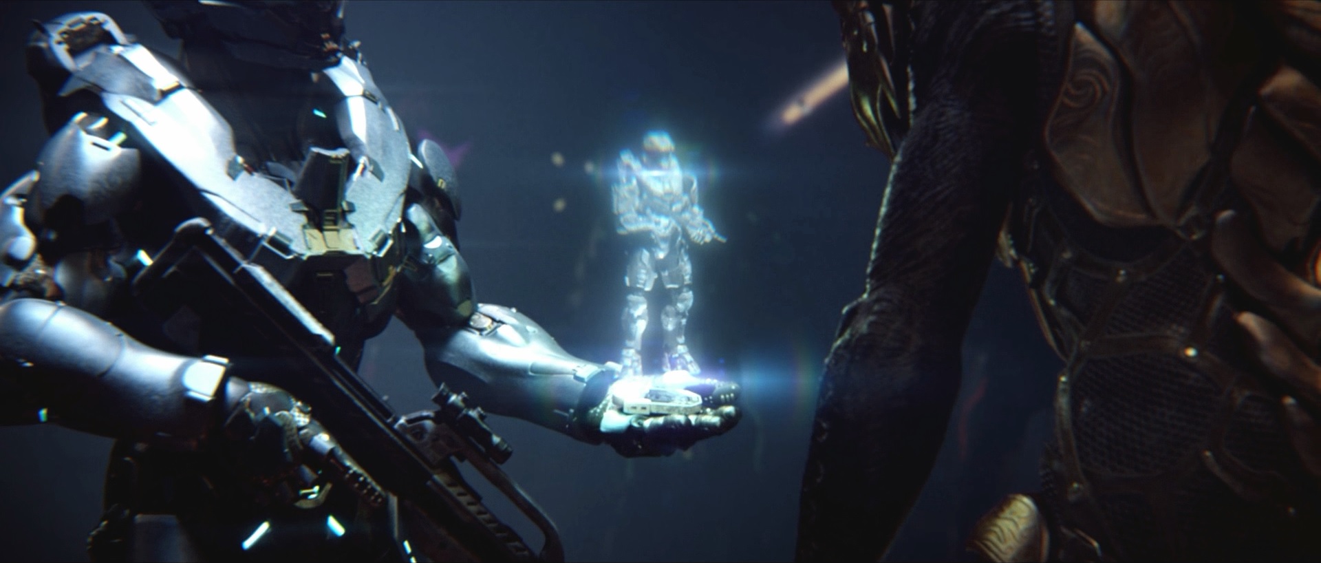 Затем Локк достает устройство и проецирует с него голографическое изображение Джона-117. Тел сразу узнает его.