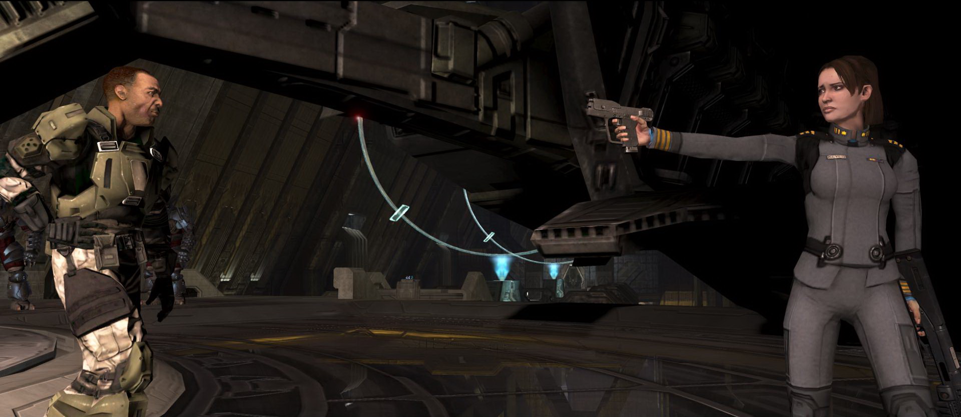 Мастер-старшина и Арбитр возвращаются к лифту. Он не работает, так что им приходится спрыгнуть в шахту в задней части комнаты.