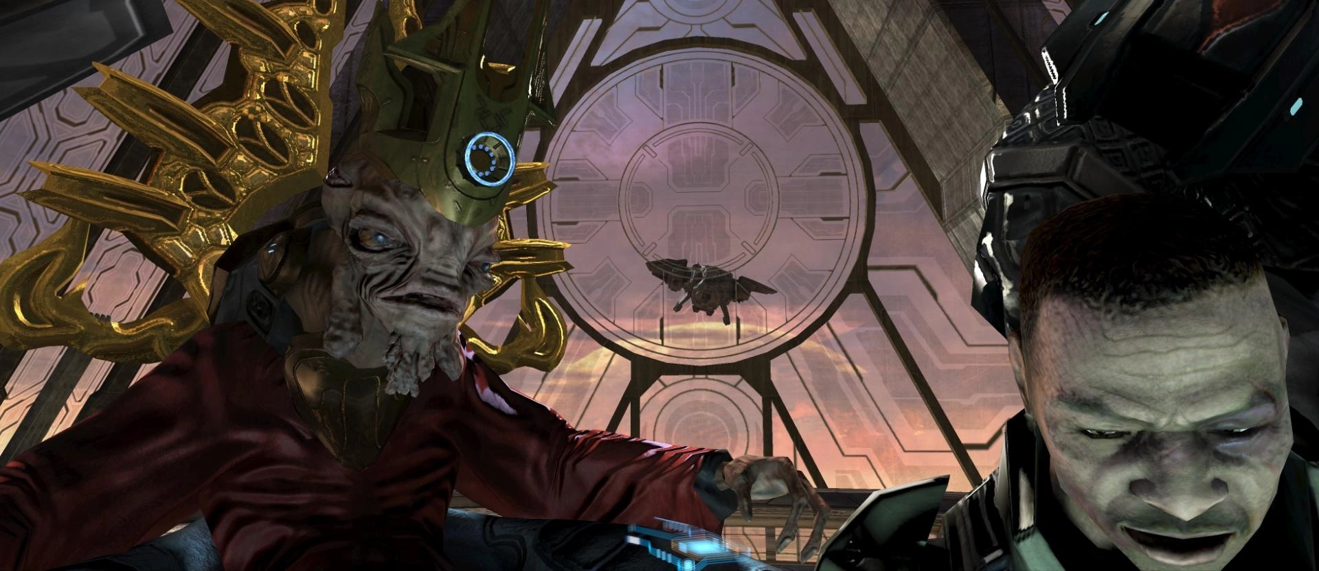 Джон-117 продолжает смотреть на погибшего командира ККОН; его плечи опущены, выдавая уныние. 'Вадам тем временем обходит вокруг платформы и подходит к Пророку Истины, слегка приподнявшемуся на полом. Энергетический меч Элита не активирован, но наготове.
