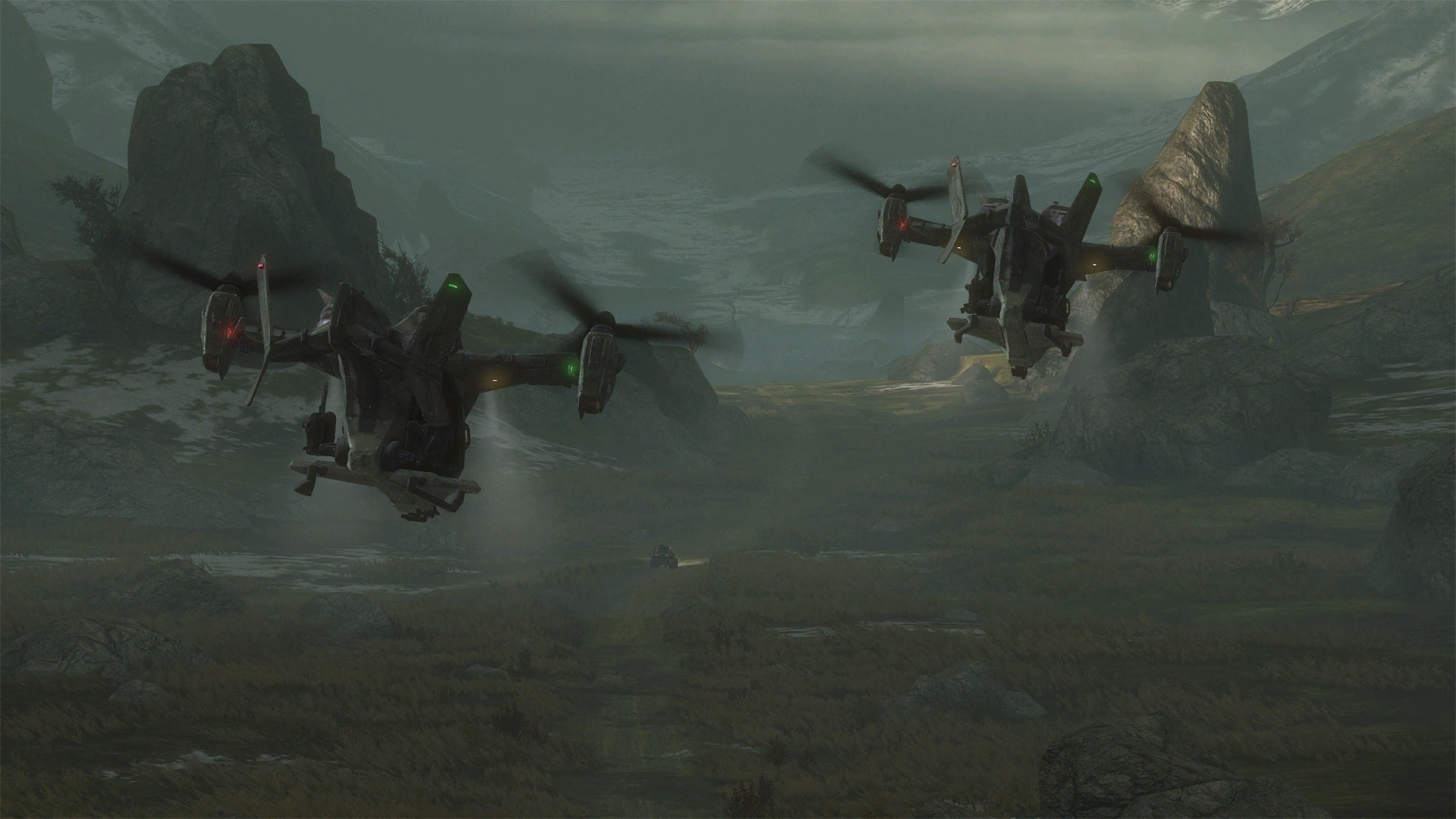 Вид от первого лица на СПАРТАНЦА-Б312, смотрящего в визор того же шлема, прежде чем надеть его. Увеличивается изображение Вепря Спартанца-Б312, который едет по поверхности Предела к аванпосту ККОН. Два UH-144 Сокол летят над Вепрем. Текст, отображаемый в правом нижнем углу экрана:
