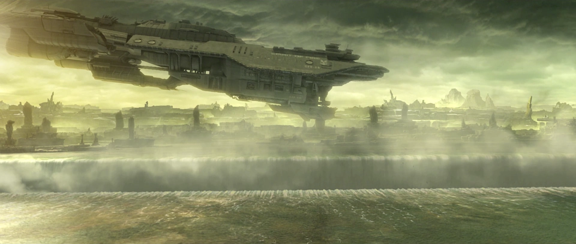 Эвакуационный рейс захвачен летающими формами Потопа и быстро уходит за пределы экрана.