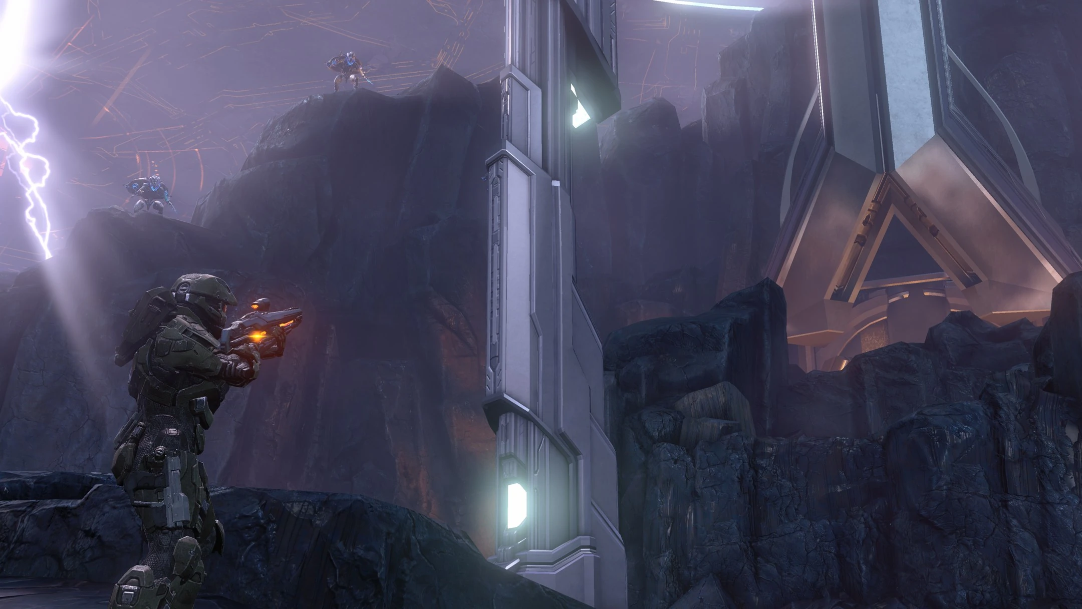 Открывается портал, и Джон проходит через него. Джон выходит из портала на той же платформе, с которой он стартовал. Справа открывается портал, и несколько крейсеров Ковенанта выходят из скользящего пространства и направляются к правому пилону.