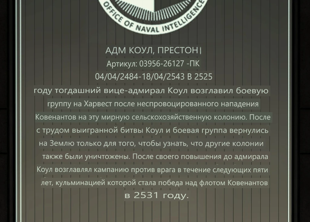 Несмотря на то, что держать войну в секрете было невозможно, 2-й отдел СВР в конце концов обнародовал сведения о ведении боевых действий против пришельцев и передал в распоряжение Коула большую часть кораблей ККОН. [8] Следующие пять лет Коул защищал от Ковенанта Внешние Колонии.