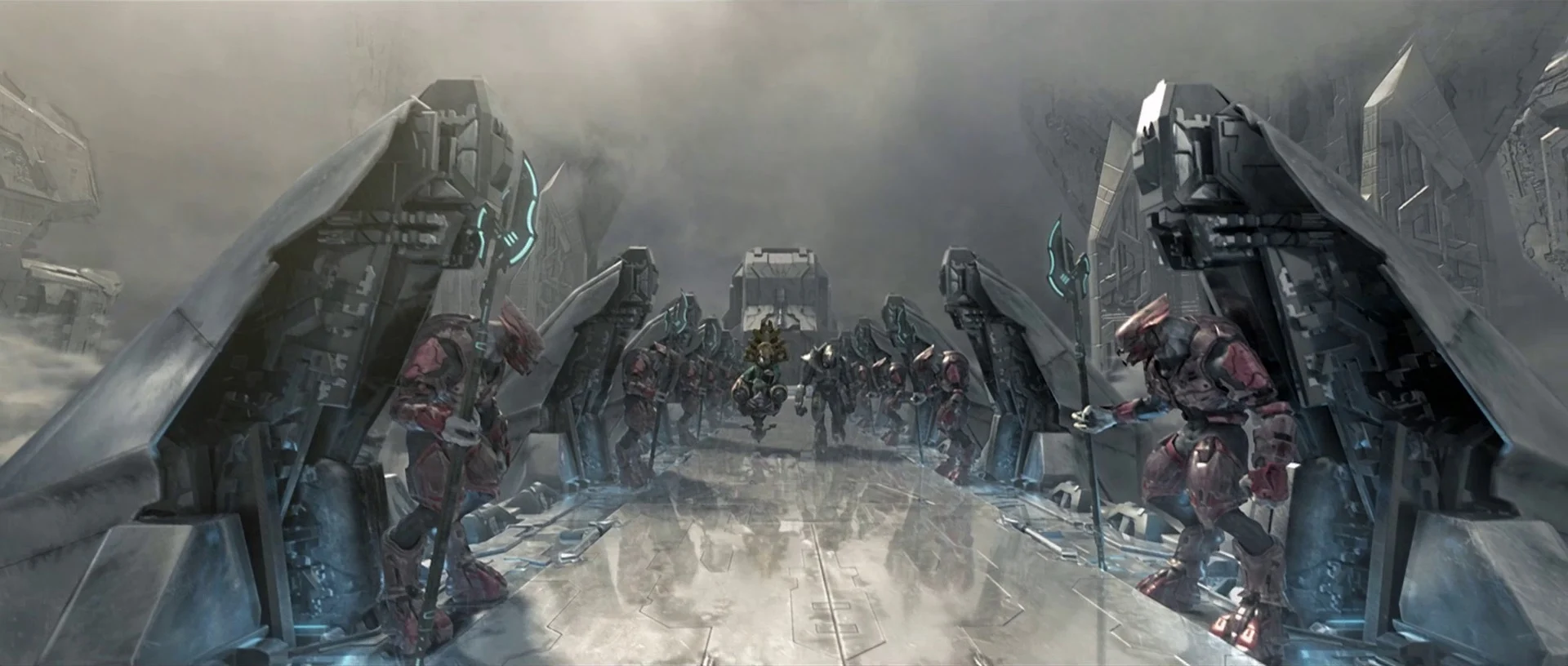 Сцена открывается на установке Предтеч, где множество почетных караулов выстроились вдоль аллеи. Арбитр идет рядом с Пророком Скорби.