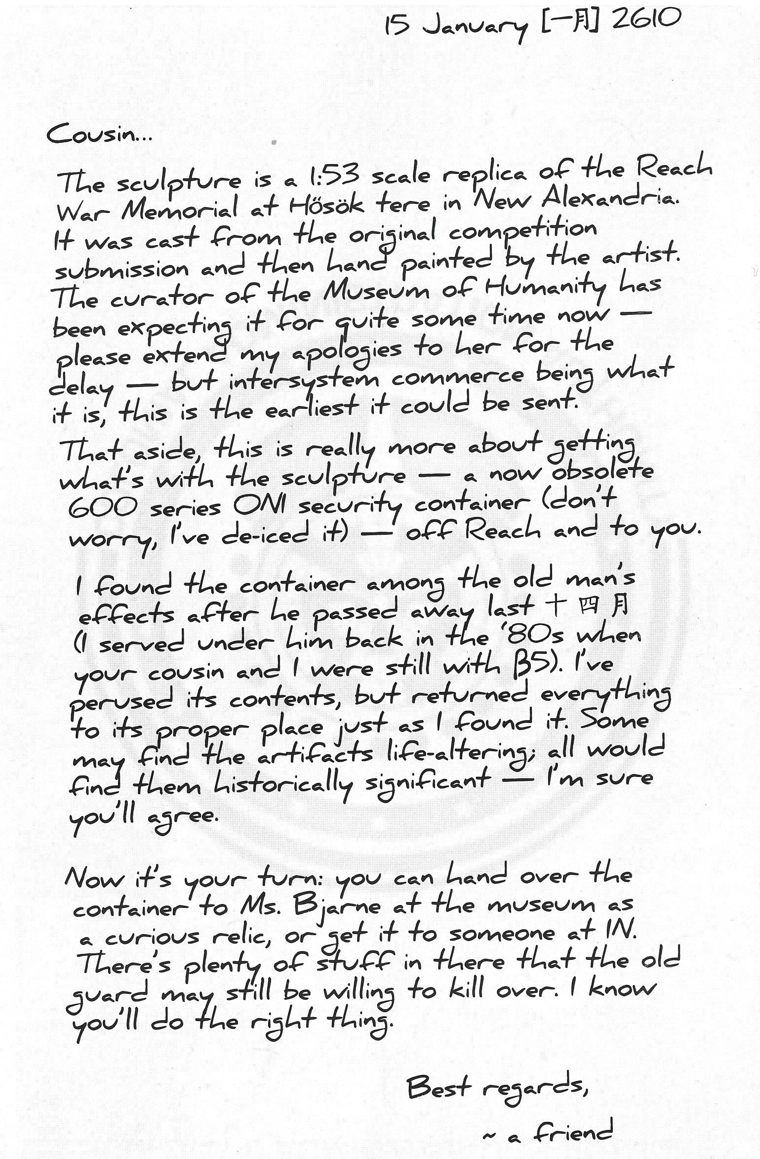 - Коллекция исторических артефактов Падения Предела отправлена бывшим агентом СВР из Эстергома, Предела, своему кузену на Земле. Среди этих артефактов - личный дневник доктора Кэтрин Хэлси и копия статуи Спартанской команды Ноубл в масштабе 1:53, основанная на статуе, воздвигнутой в Хосок-тере в Новой Александрии. Коллекция поставляется в защищенном контейнере СВР 600-й серии, масштабная копия статуи предназначена для куратора Музея Человечества г-жи Бьярне, а дневник можно было передать на выбор Бьярне или кому-то в "Межсистемные новости".[1]