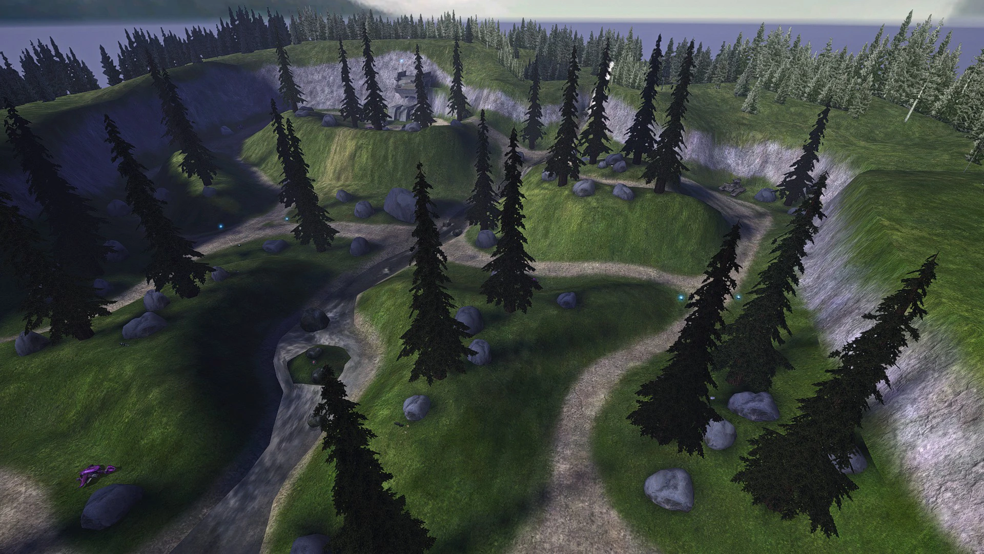 - На Team Slayer, с отключенным дружественным огнем, садитесь в Призрак и поднимайтесь на холм слева от базы Синих. Выйдите из Призрака и дайте товарищу по команде взять его. Затем пусть товарищ по команде въедет в вас. Вы должны пройти мимо невидимой стены. Затем идите налево к углу области, за деревьями находится надпись DMM 2003. DMM 2003 означает Дэвид М. Мерц и год выхода Halo: Combat Evolved для ПК (2003).