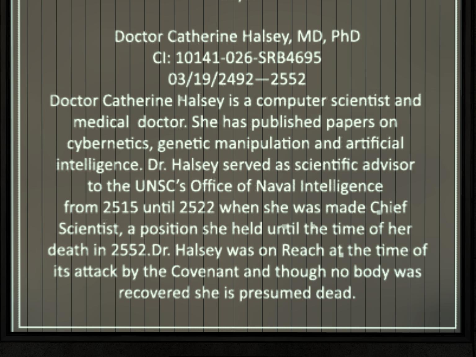 Catherine Elizabeth Halsey, MD, PhD (SN: CC-409871),[11] was a praised scientist and former employee turned prisoner of the Office of Naval Intelligence, best known as the creator of the SPARTAN-II Program and Mjolnir Powered Assault Armor.