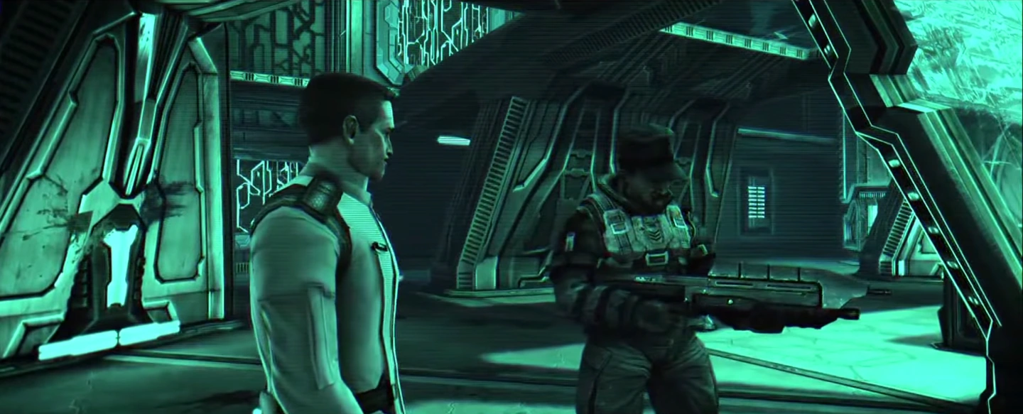 Captain Jacob Keyes ready for combat on the Truth and Reconciliation, wielding a needler.