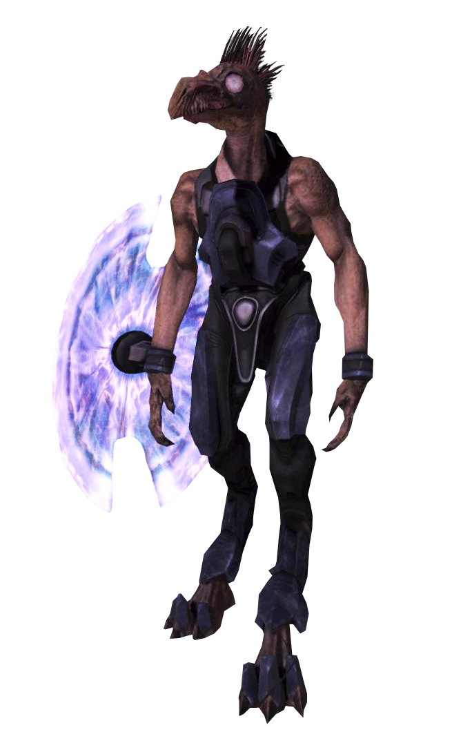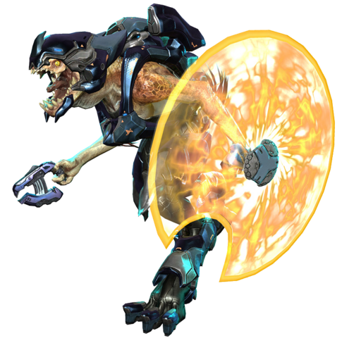Kig-Yar Majors are more experienced than Minors and are issued stronger point-defense gauntlets that emit a violet-colored shield post Great Schism and an orange or red colored shield pre-Great Schism. They typically carry Plasma Pistols and Needlers. Because of their high rank they will occasionally wield a Plasma Rifle. |