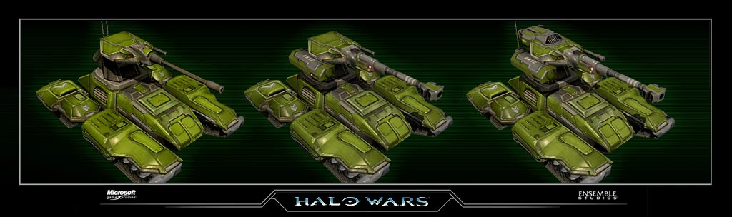 From left to right: the Scorpion from the least to the most upgraded variant in Halo Wars.