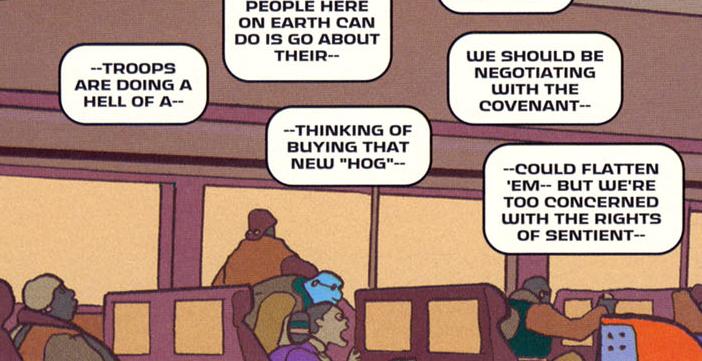 Commuters aboard a passenger carriage discuss ONI propaganda.
