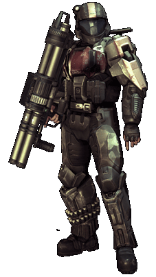 Close Quarters | While designated as a CQB suit, this variant is also issued to demolition experts in the field. This BDU is specifically designed to aid an ODST in CQB situations. The standard left pauldron is replaced with a longer two piece ballistic plate, which aids in protecting the trooper's upper body while in a firing stance, and also to reduce severe injury from plasma-based weaponry. The helmet is also issued with an optics device that aids the user in relaying images and video to teammates or command. |