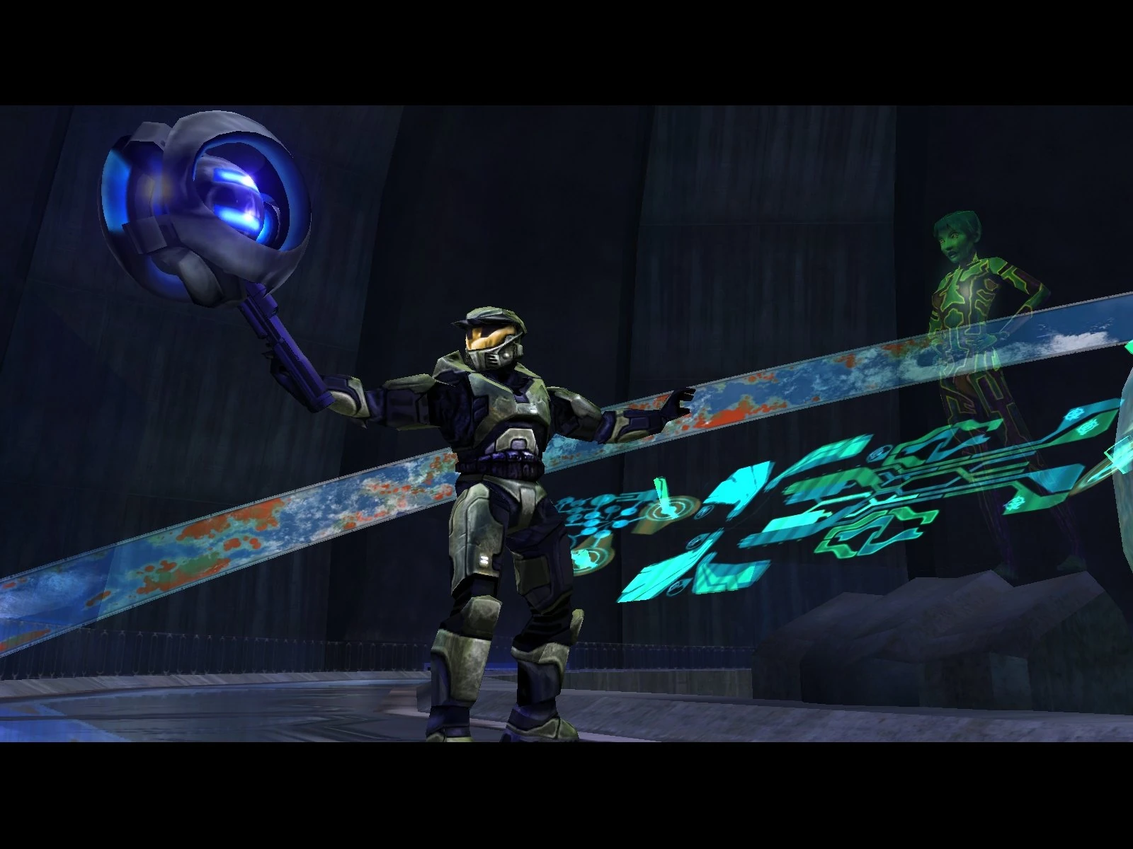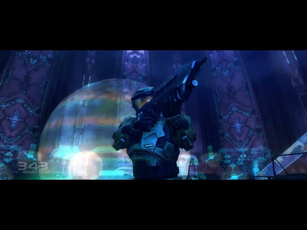 Long shot of the Control Room. Master Chief and 343 Guilty Spark teleport in, obviously in the middle of a conversation, explaining something about the Flood.