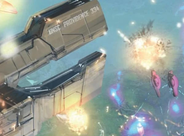 In the Halo Encyclopedia, the Providence is shown battling three CCS-class battlecruisers in high atmosphere over an unknown planet, along with another frigate. It later shows the Providence being destroyed by a group of Covenant ships in space. Due to the terrain of the planet and the fact that these artworks have only recently surfaced, these images are speculated to be concept art of Halo: Reach.